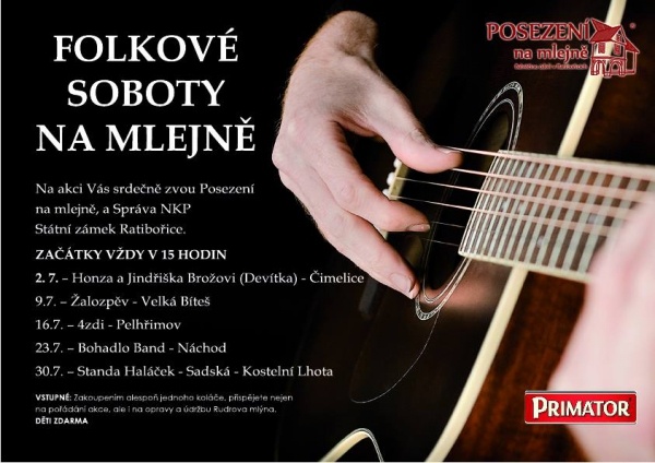 Folkové léto na mlejně v Ratibořicích. Zač. 16 hod. Letní cyklus vystoupení folkových kapel a jednotlivých interpretů ve dvoře Rudrova mlýna.