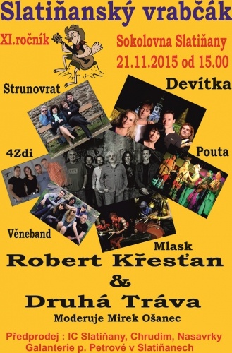 Slatiňanský vrabčák, Slatiňany, Sokolovna, 15hod - Malý hudební festival žánru folk-country.Festival pořádá a organizuje se svou kapelou Strunovrat Petr Šotta.