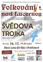 Vánoční Folkování nad Lucernou se tradičně nese ve slavnostnější náladě a celková atmosféra jakoby mírně zaváněla purpurovou vůní. Nebylo tomu jinak ani 16. prosince v malém sále KD Máj, kam jsme si pozvali tentokrát trio z Moravského Krumlova – Švedovu trojku. Zimní díl právě tímto večerem uzavřel již čtvrtý rok svého samostatného života a proto bylo nutné trochu zabilancovat. Za čtyři roky své existence pořad přivítal na svých prknech kolem 35 účinkujících, kapel i jednotlivců a jména? Martin Rous, Stráníci, Nestíháme, Marien, Epy de Mye, Náhlá změna, Přelet MS, Arnošt Frauenberg, Šantré, Jen tak tak a další a další...jsou dokladem toho, že se tady hraje fakt prima muzika a pelhřimovští, že určitě „neostrouhávají“.