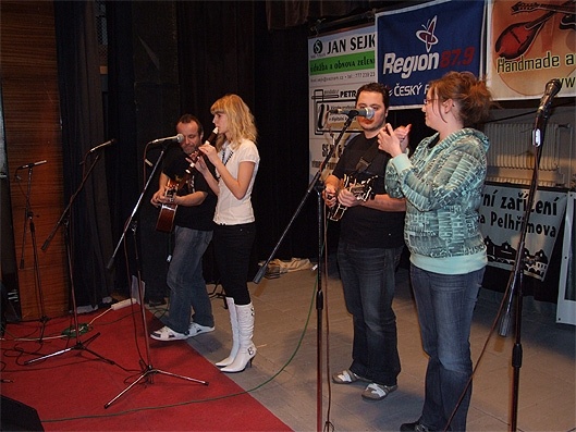 Nicméně jsme i přes tento fakt rádi přijali pozvání známě folkové formace 4zdi do jejich pořadu Folkování nad Lucernou v KD Máj v městě Pelhřimově. Jelikož jsme s Verunkou jeli sami a naši pardubičtí chlapci za námi měli teprve dorazit po vlastní ose, šli jsme do restaurace na nějaké to papání, páč nám po té vysilující jízdě nějak vyhládlo. Cestou jsme potkali Víťu Troníčka, kterého mezitím přivezl jeho divadelní kolega Michal a po vřelém pozdravení, nám prozradil, že v té restauraci mají bezvadný knedlíky s vejci, tak jsme se nešidili a dali si rovnou dvě porce vč. červené řepy. S takto naplněnými žaludky jsme se vrátili do šatny v KD, s tím, že jsme se dlouho neviděli a že bychom se měli nejdříve trochu rozehrát. Feďa mezitím taky dorazil a tak jsme byli kompletní. Tentokrát Feďa nepřivezl kontrabas, jelikož si pár dnů před tím nešťastně opařil obě ruce při zachraňování bytu a především své dcerky, proti vařící vodě, která se řinula z poškozeného ventilu na topení. Měl vlastně i co dělat, aby mohl hrát na svou novou bezpřašcovou baskytaru, ale musíme říci, že na jeho výkonu to nebylo nijak znát. Je to velmi statečný chlapec a příkladný otec.
